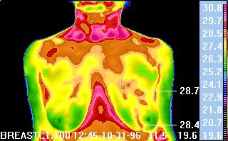 with thermal intensity in the left breast. Cooler right breast, nipple